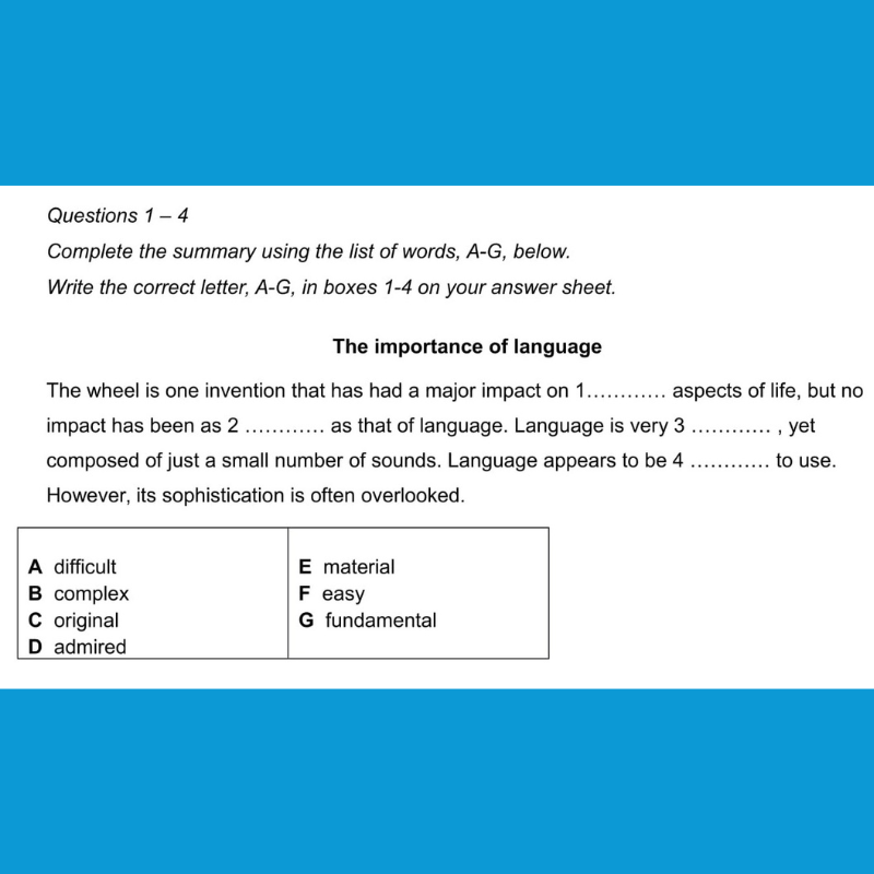 Mô tả: Hoàn thành đoạn tóm tắt bằng từ trong passage hoặc chọn từ từ danh sách cho sẵn trong khung. Đây là dạng quan trọng trong IELTS Reading question types.
