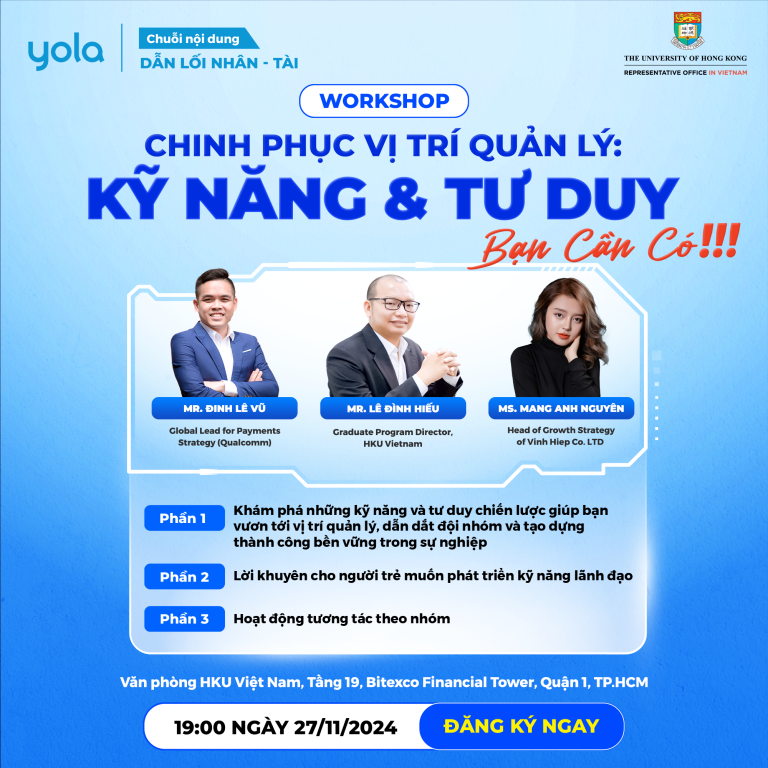 Đối tượng tham gia: Tất cả sinh viên & người đi làm từ 22 tuổi trở lên Số lượng có hạn, đăng ký ngay tại: https://hku-vn.org/r/YOLA-Workshop-Nov2024 Thành công không chỉ đến từ sự cố gắng, mà còn đòi hỏi tư duy chiến lược và kỹ năng lãnh đạo vượt trội. Workshop lần này là cơ hội […]